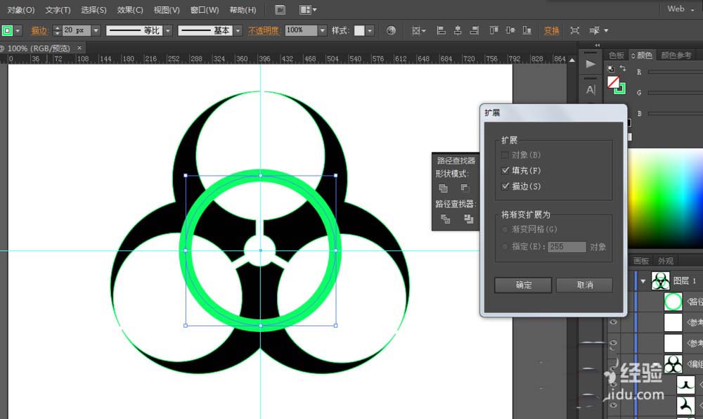 6、绘制一个只有描边大小的圆圈,并且进行扩展对象,然后复制一份底层,外轮廓也要进行描边的增加,并且扩展对象。最后去掉顶部。