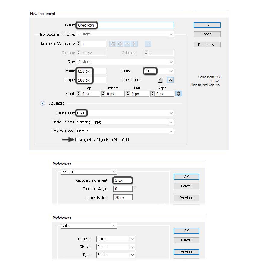 启动 Illustrator 并转到文件>新建以打开空白文档。为文件输入一个名称,设置尺寸,然后选择像素 为 单位, RGB 为 颜色模式。确保未将新对象对齐到像素网格。