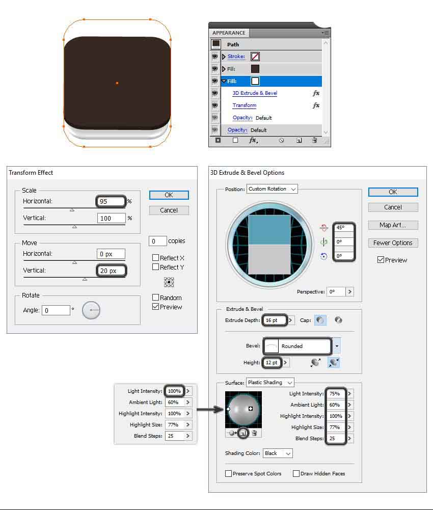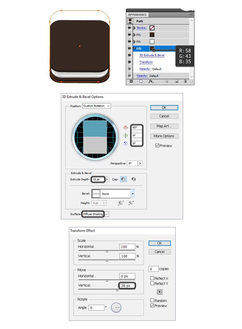 步骤1、抓住圆角矩形工具并绘制所示尺寸的第一个形状。使用深褐色作为填充颜色(1)。当图标的形状保持选定状态时,转到效果> 3D>拉伸和斜角,然后应用指示的设置(2)。