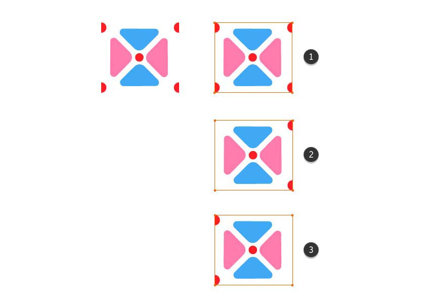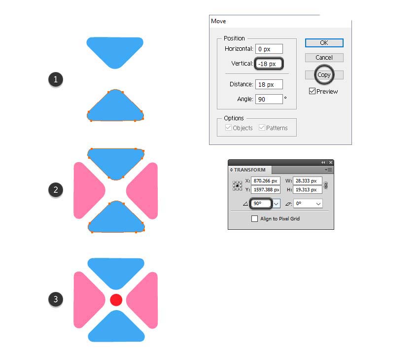 复制 并粘贴在前面(Control-F) 这两个三角形,并使用变换 面板将它们旋转90度。因此,你会得到一对新的三角形(2)。用相同的颜色(蓝色)填充顶部和底部形状,用不同的颜色(粉红色)填充左侧和右侧形状,最后在填充第三种不同颜色(红色)的中心绘制一个4 x 4像素圆, (3)。颜色将在本教程的后面部分介绍。