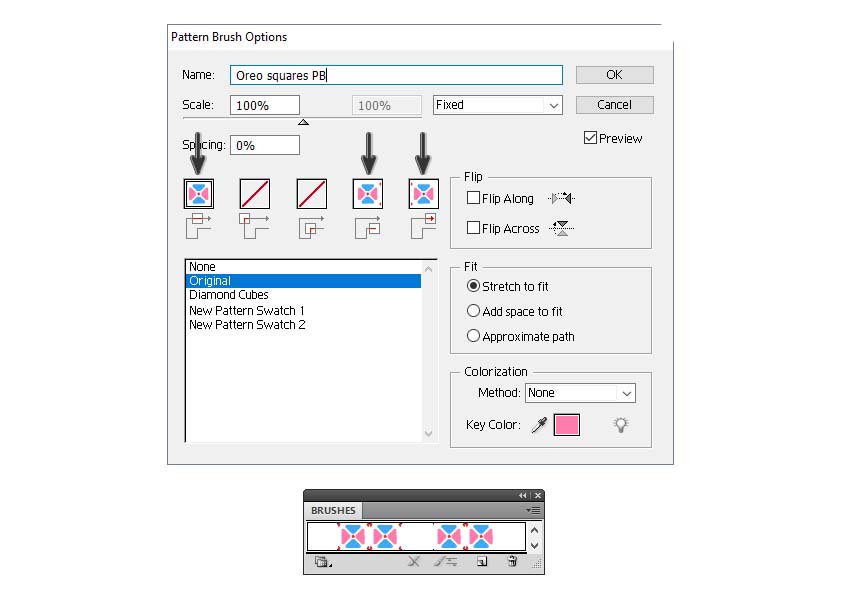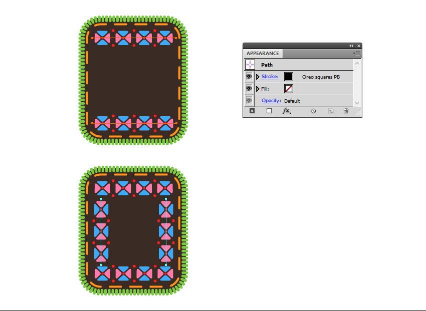第8步、使用钢笔工具(P)或线段工具(\)在顶部和底部绘制直线路径,并使用先前保存的Oreo Squares Pattern Brush对其进行描边。调整路径的长度,使每个只有四个方格。接下来,在两侧绘制两条直线路径,并再次应用Oreo Squares Pattern Brush。这次你应该每条路径只有三个方格。