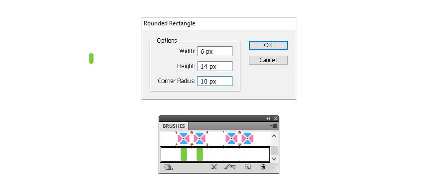 第5步、在充满绿色的画板上绘制一个小圆角矩形,然后将其拖入“ 画笔”面板中以将其保存为新图案画笔。你可以将它命名为Oreo Edge Pattern Brush。