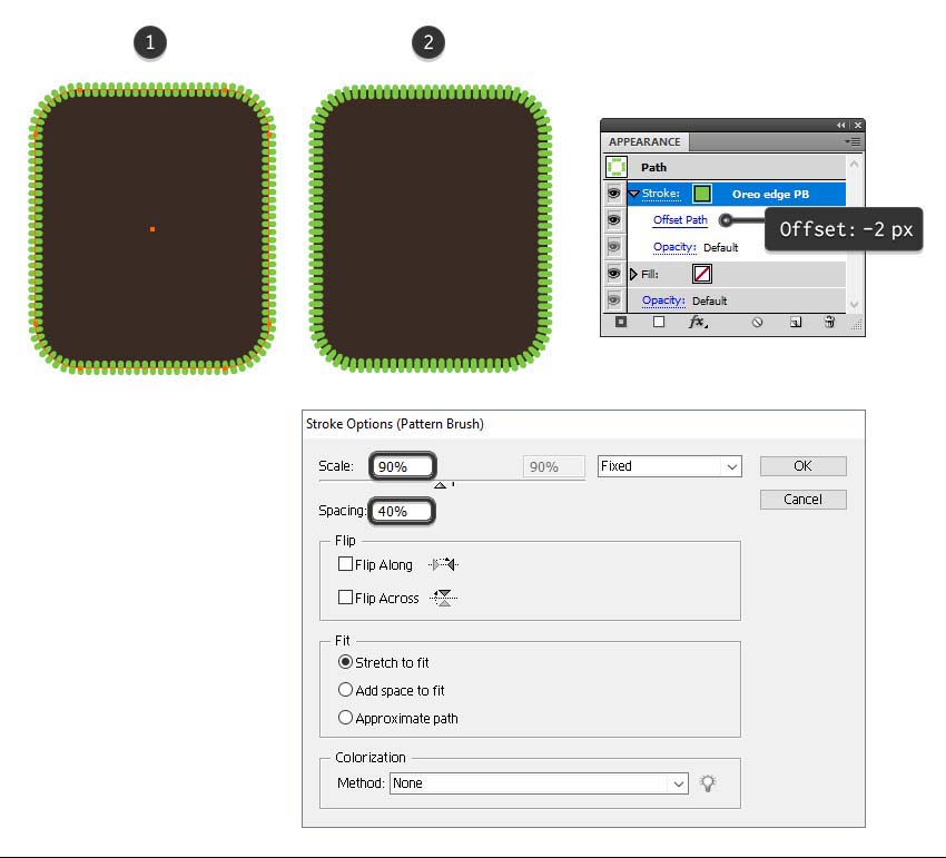 第6步、复制图标形状并删除所有现有的外观和效果。它应该 只有 棕色填充颜色。复制并粘贴在前面(Control-F)此形状,移除填充颜色,并使用Oreo Edge Pattern Brush对其进行描边。打开“ 描边选项”窗口并更改“ 缩放 和间距”设置(1)。接下来,转到效果>路径>偏移路径,并应用-2 px的偏移量使绿色边缘略微向内(2)。
