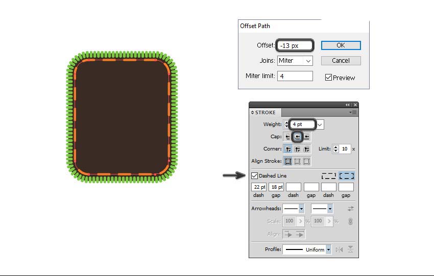 第7步、在棕色长方形前做另一个副本; 然后转到对象>路径>偏移路径并应用-13 px的偏移量。你会得到一个更小的形状。删除填充颜色,并给它一个4磅的橙色 笔画。按下“ 描边”面板中的“ 圆帽”图标,然后选中“ 虚线”选项。输入显示的破折号和间隔值。