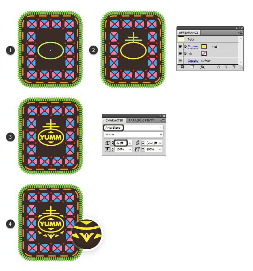 第9步、在中心(1)绘制一个椭圆,然后是上面的三条路径(2),并给它们一个4磅的黄色笔画。同时选择圆帽选项。现在,抓住类型工具(T)并使用字体Anja Eliane(大小为22磅),然后在文本上方和下方两个小黄色三角形写入“YUMM” (3)。在椭圆周围用更多的黄色三角形或其他类似的装饰完成奥利奥设计(4)。