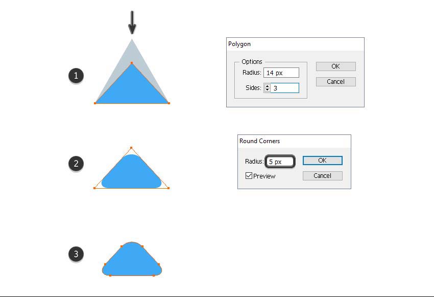 步骤1、使用多边形工具绘制一个显示尺寸的三角形。然后使用直接选择工具(A)仅选择顶部定位点, 并通过按下向下箭头键八次将其向下移动8 px。新的三角形是蓝色的(1)。现在,去影响>风格化>圆角和应用半径的5 PX(2); 然后从对象菜单(3)中选择展开外观。