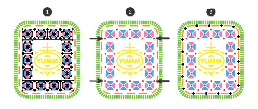 第10步、选择Oreo Squares Pattern Brush抚摸的四条路径,然后从“ 对象”菜单中选择“ 展开外观 ” ,将它们从笔画变成填充(1)。现在,使用直接选择工具(A)选择 其中一个红色圆圈,并在箭头(2)指示的空白位置安排四个红色圆圈。制作红圈的更多副本,并在橙色虚线(3)之间布置一个。最后,选择绿色边缘并再次选择“ 扩展外观”以展开应用的 偏移效果。