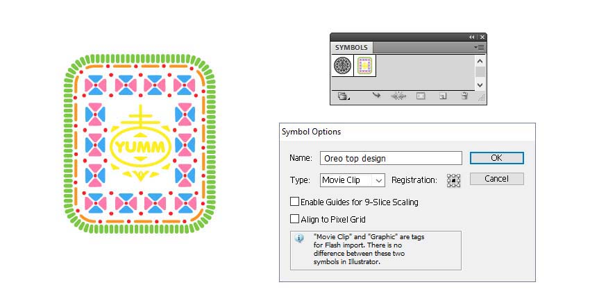 第11步、此时,奥利奥设计已准备就绪,您可以删除棕色矩形。将所有内容拖到“ 符号”面板中,输入名称,然后点击“ 确定”。