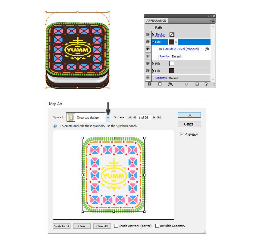 第12步、让我们返回到奥利奥图标,并保持选中状态时,打开应用于顶部棕色“填充”属性的3D 效果。在选项 窗口中,按下地图艺术按钮。在 对象的曲面1上,选择并应用保存的奥利奥设计符号。点击确定,你应该看到顶部饼干的设计。