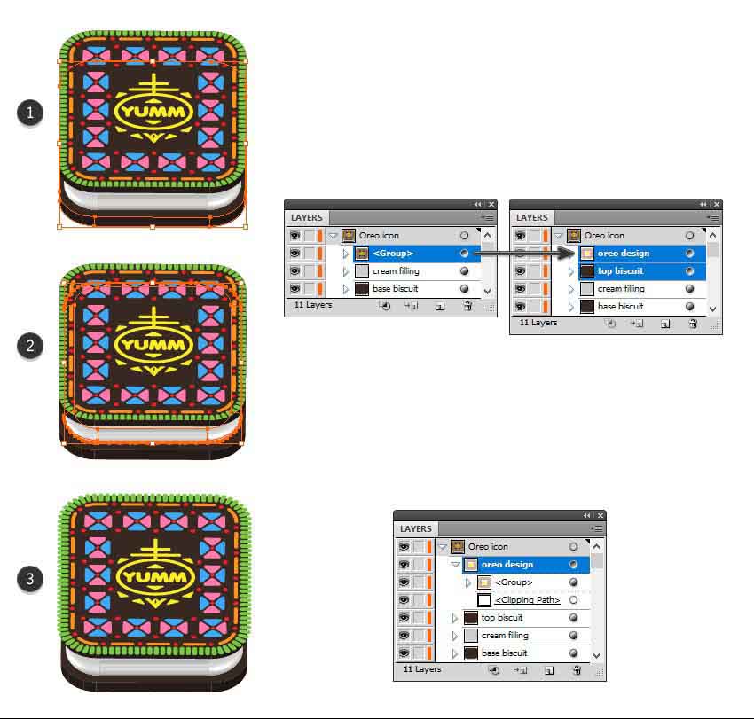 选择“ 奥利奥设计 ”组,然后转到对象>剪贴蒙版>释放(Alt-Control-7)以删除现有蒙版(3)。