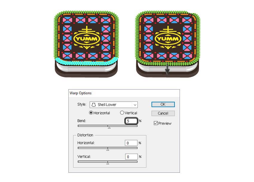第3步、在图标形状保持选定状态时,转到“ 外观”面板并在底部添加 新填充。使用深褐色作为填充颜色。使用显示的设置应用 3D效果,然后应用“ 变形” 效果。因此,你会得到第二个饼干在底部。