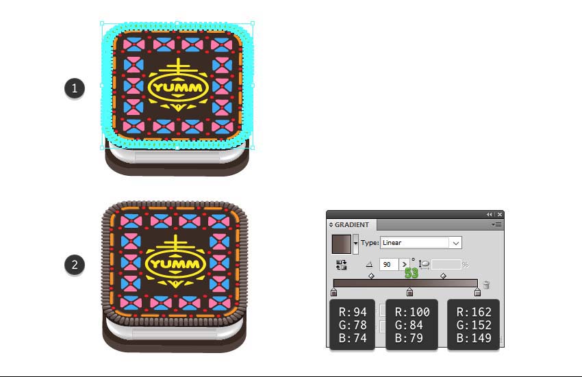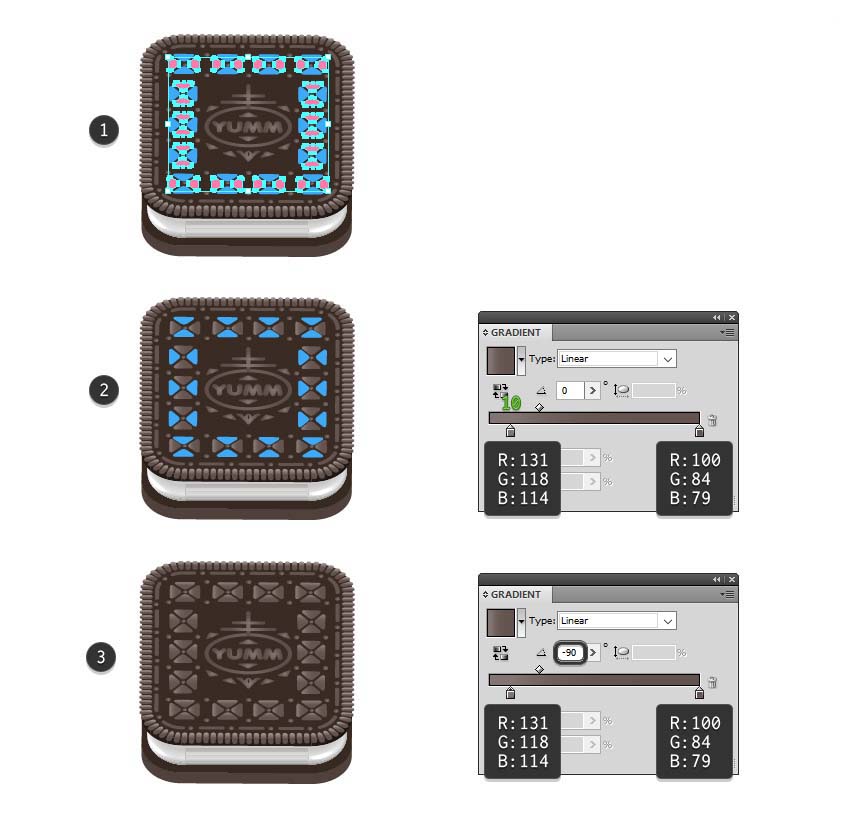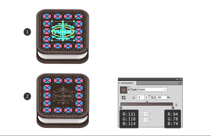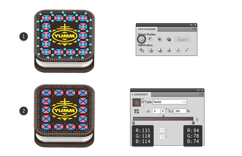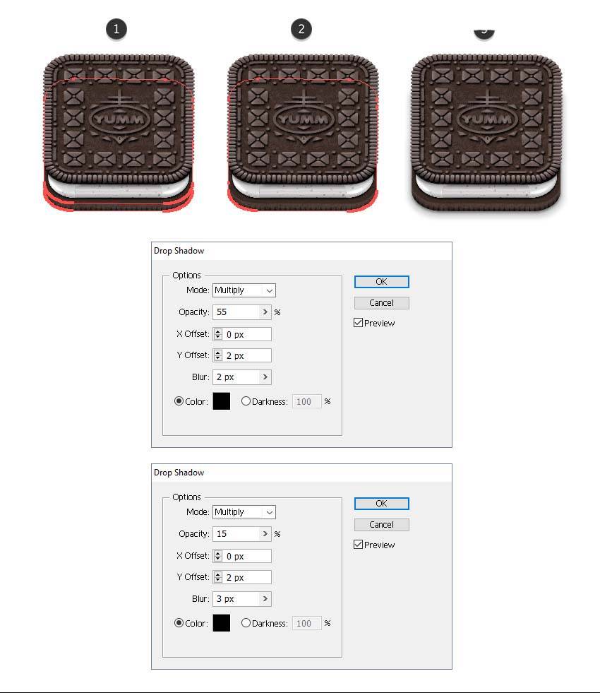 从“ 图层”面板中选择“ 基础饼干 ”组,然后选择“ 复制并 粘贴到位”(Shift-Control-V)。将副本移到Oreo图标下的新图层(1)。在Pathfinder面板中按Unite或转到 对象>复合路径>制作(Control-8)以获取单个形状(2)。选择深褐色作为填充颜色并应用两次阴影效果以获得阴影(3)。