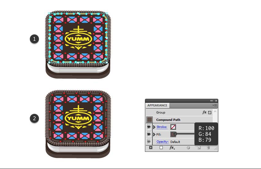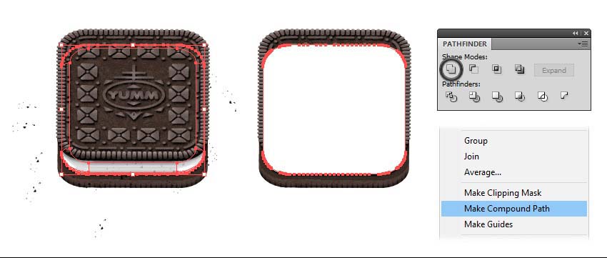 现在,从“ 图层”面板中选择“ 奥利奥设计 ”组,然后选择 复制和粘贴到位(Shift-Control-V)进行复制并删除之前应用的阴影效果。转到对象>复合路径>使(控制-8)将所有形状转化为单个复合路径(2)。
