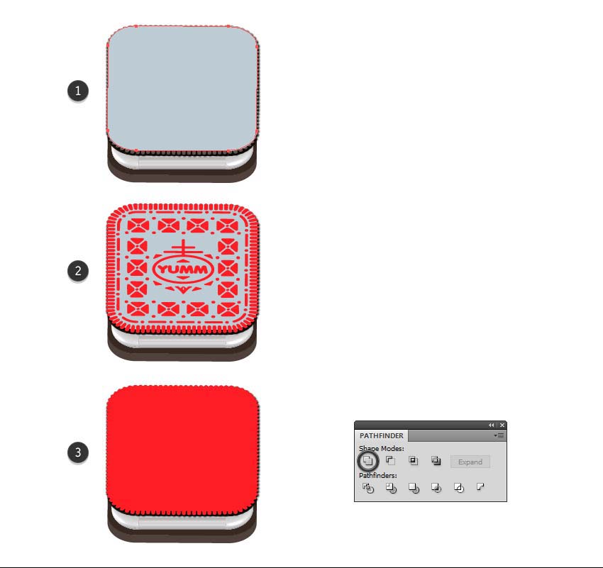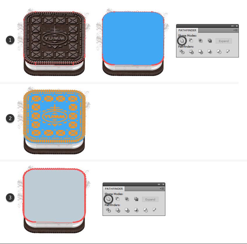 第3步、转到图层面板,选择“ 顶部饼干 ”组,然后在位置复制 和粘贴(Shift-Control-V)。在Pathfinder 面板中按Unite将所有形状合并成一个(1)。选择“ 奥利奥设计 ”组,然后选择复制并粘贴到位(Shift-Control-V),将其复制到所有内容的前面。删除阴影效果并转到对象>复合路径>制作(对照-8)(2)。现在,选择新获得的蓝色和橙色形状,并在Pathfinder面板中按Unite以获得我们需要的形状(3)。