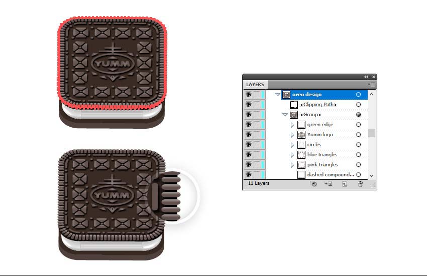 在所有内容前复制相同的形状,并将其设置为stroke-none和fill-none。在选中此副本的同时,还应选择两组线条和应用了“ 纹理”效果的形状,然后转到“ 对象”>“剪贴蒙版”>“制作”(对照7)。因此,您将在“ 顶部饼干”(3)周围获得干净的边缘。