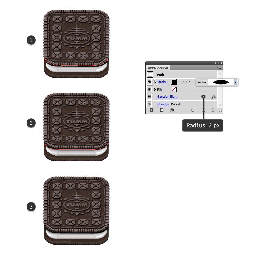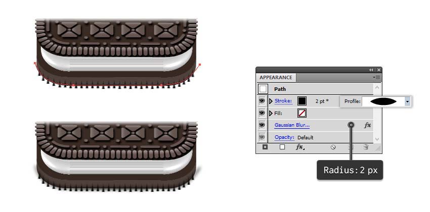 第2步、使用钢笔工具(P)在基础饼干的底部边缘之后绘制一条路径。给它一个2 pt的黑色笔触,并在笔画面板中使用 Width Profile 1。接下来,去影响>模糊>高斯模糊,并应用半径的2像素。