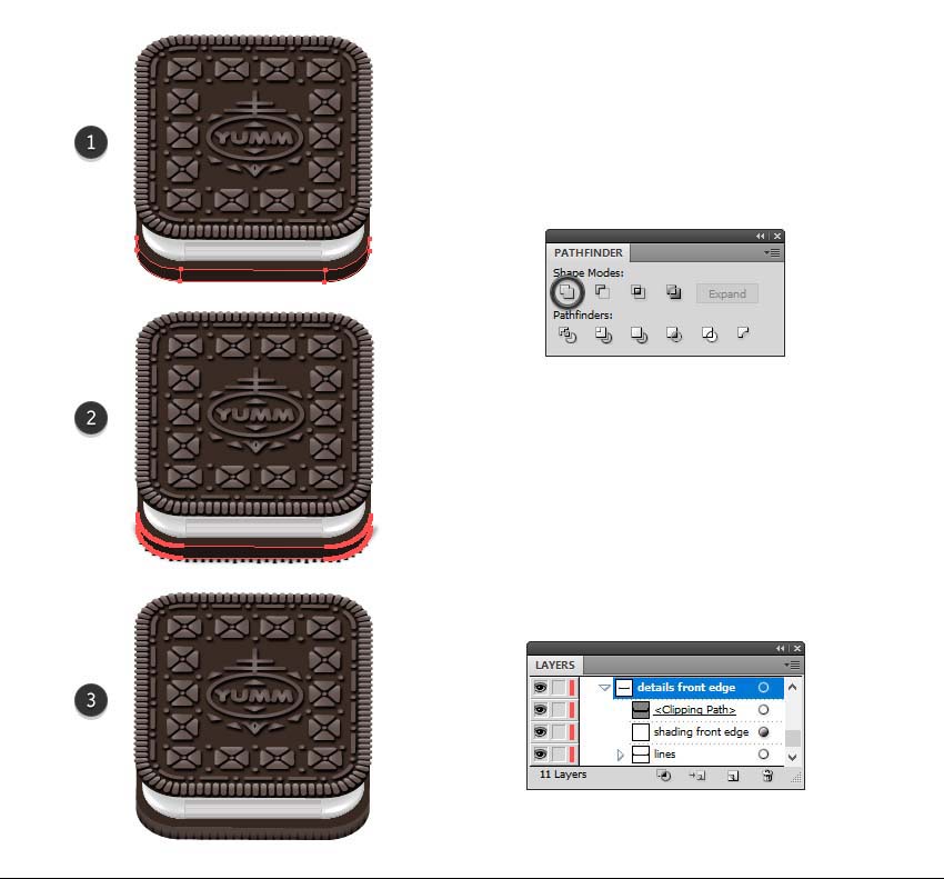 第3步、转到图层面板,找到并仅选择基础饼干的前边框(1),然后选择复制并粘贴到位(Shift-Control-V)以制作它的副本。在探路者面板中按团结将这些形状合并成一个(2)。将生成的形状设置为stroke-none和fill-none,我们将使用它来掩盖上一步(3)中的线组和阴影路径。