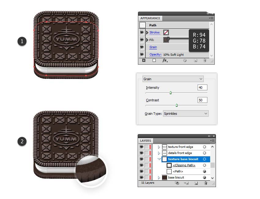 第5步、转到图层面板,找到并选择基础饼干的顶部形状,然后复制并粘贴到位(Shift-Control-V)以制作它的副本。转到效果>纹理并应用谷物效果; 然后将其设置为混合模式 柔光和 10%不透明度(1)。