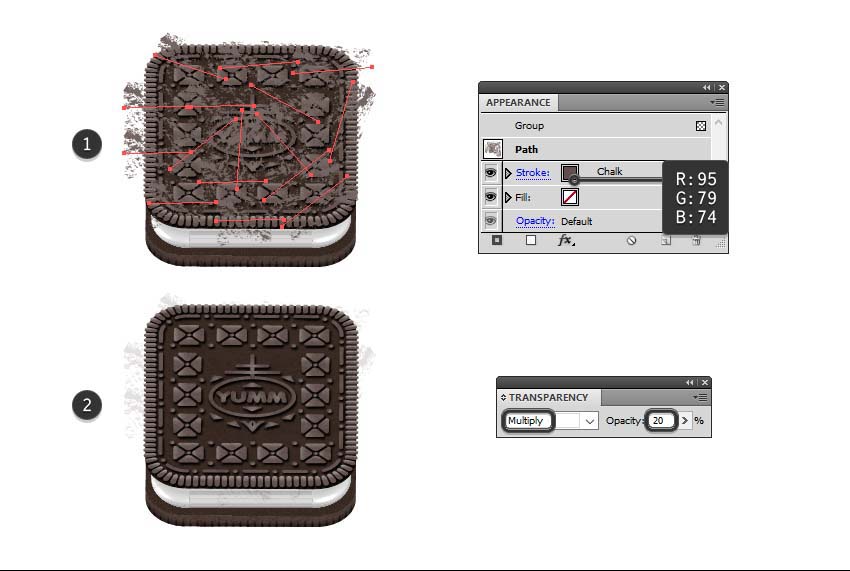 步骤1、使用钢笔工具(P)或线段工具(\)在“ 顶部饼干 ” 上绘制一组直线路径,并用粉笔艺术笔刷对其进行描边。使用指示为笔触颜色的棕色阴影(1)。将所有这些路径分组(Control-G)并将整个组设置为混合模式乘法和20%不透明度(2)。