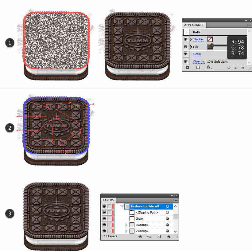复制上一步中的蒙版形状,并再次使用它来掩盖这些路径(2)。因此,你会在基础饼干(3)上得到一些纹理。