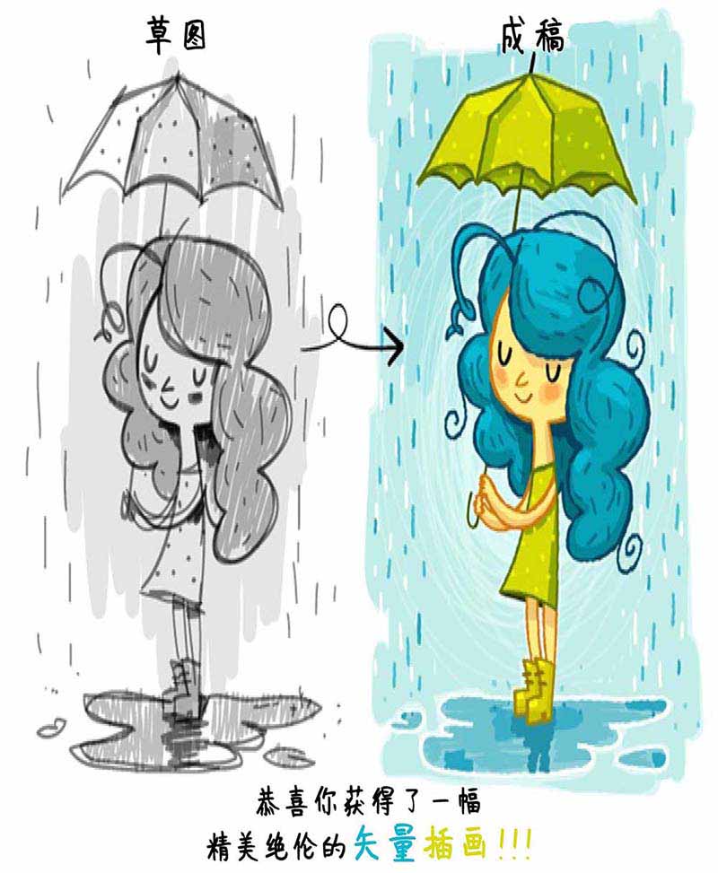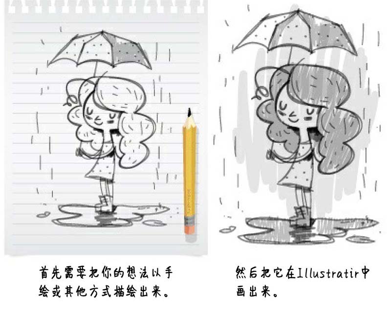 无论是艺术创作还是图库供图,草图总是最重要的环节。当脑海中有了零星模糊的想法时,其实并不一定知道自己在画草图时究竟会创作出怎样的作品。通常你最早的灵感、想法都比较简单、片面,很少能成为自己具有代表性的作品,所以绘制大量的草图才是最有效的。草图的绘制是一个非常有趣的探索过程,你可以在不同的想法与探索中找到最好的那一个。当然首先你需要在纸上绘制出草图,然后扫描成数字稿件,并在Illustrator中打开你的草图。在这个过程之初很重要的一件事就是要找到一个自己最满意的草图,把它导入illustrator,这样我们就可以把它制作成一个矢量插画。