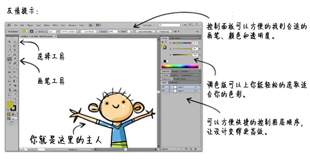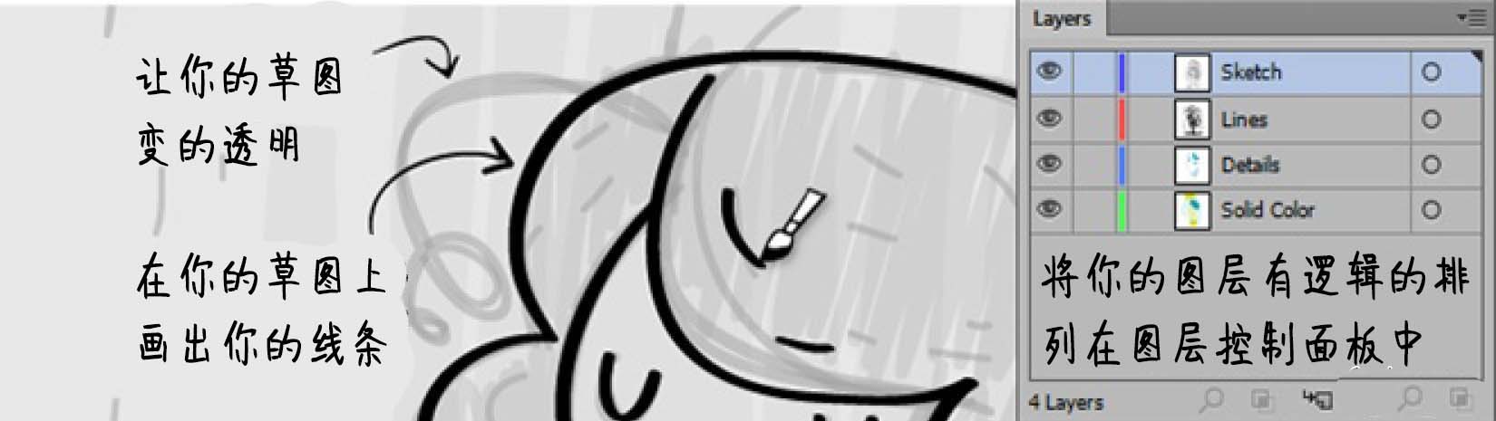 在illustrator中画好了想要的草图后,我们就可以接着创作了。使用illustrator的透明度设置,使你的草图变成透明的;保持你在插画创作过程中调色板始终是打开状态的;最好是把你的透明草图层放在所有图层的最顶部,然后在之后的创作过程中依次在草稿层下创建新的图层。
