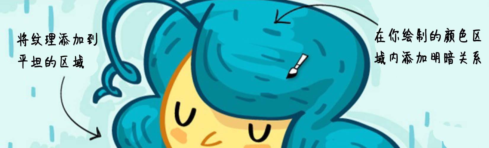 现在,在作品的基本颜色层之上(当然是线稿层下面),我们将添加一些颜色细节,使用画笔工具在你平铺的色彩区域内,适当增加一些更深和更轻的色调来添加阴影和亮部效果,这样可以使得平面区域更加真实。