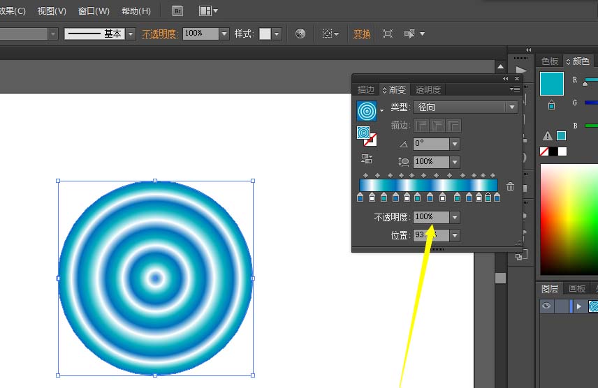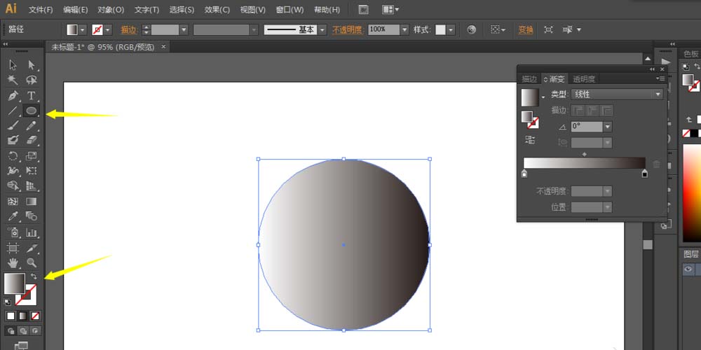 1、新建一个任意大小的文件,颜色选RGB,用椭圆工具绘制一个圆形,描边色不选取,填充色选为渐变颜色的。