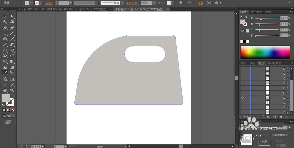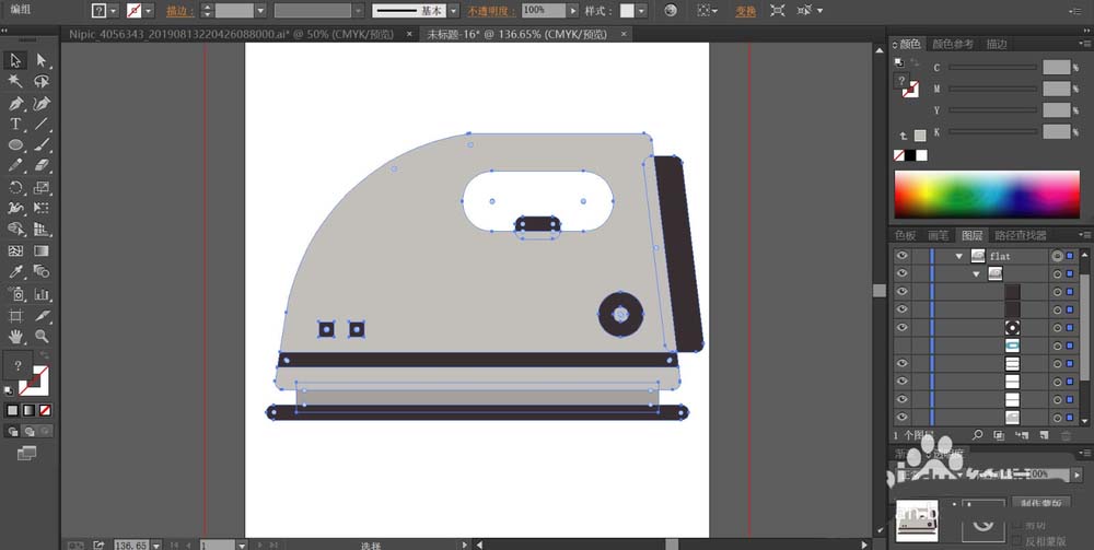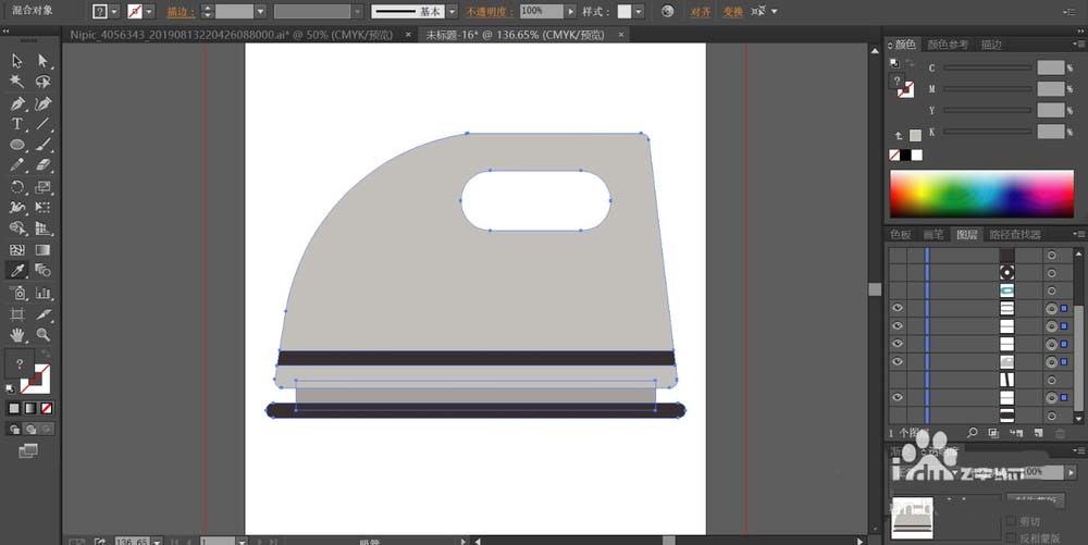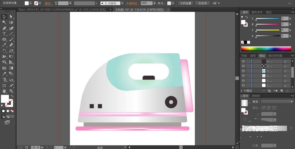 6、接着,我们再来绘制一个立体效果的熨斗,先用灰色的渐变填充熨斗的主体路径,再用网格工具给熨斗的右侧零件,上下层的结构件做出粉红色的渐变,完成熨斗素材设计。