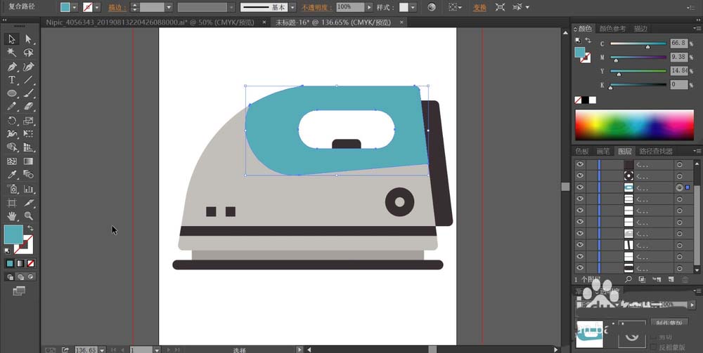 5、设置前景色为青色,继续用青色填充熨斗的手柄路径。完成熨斗的平面素材的设计。