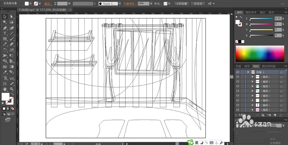 1、先用钢笔画出房间的整个轮廓,包括窗户、窗帘、墙壁与地板,还有墙壁上面的搁板等等元素的路径。