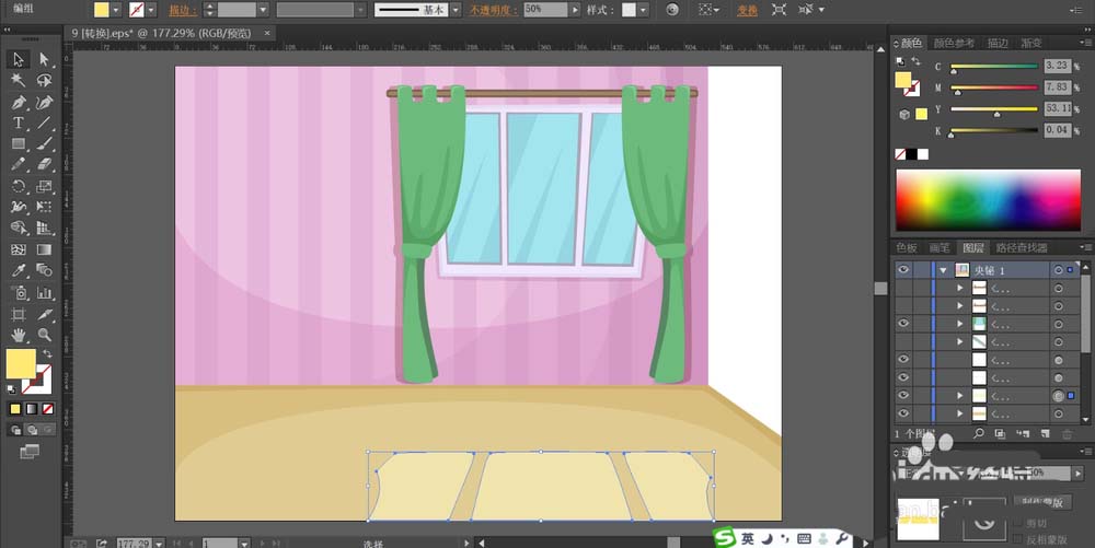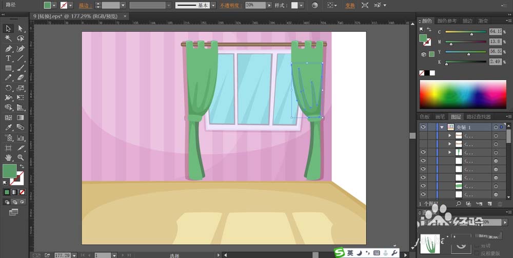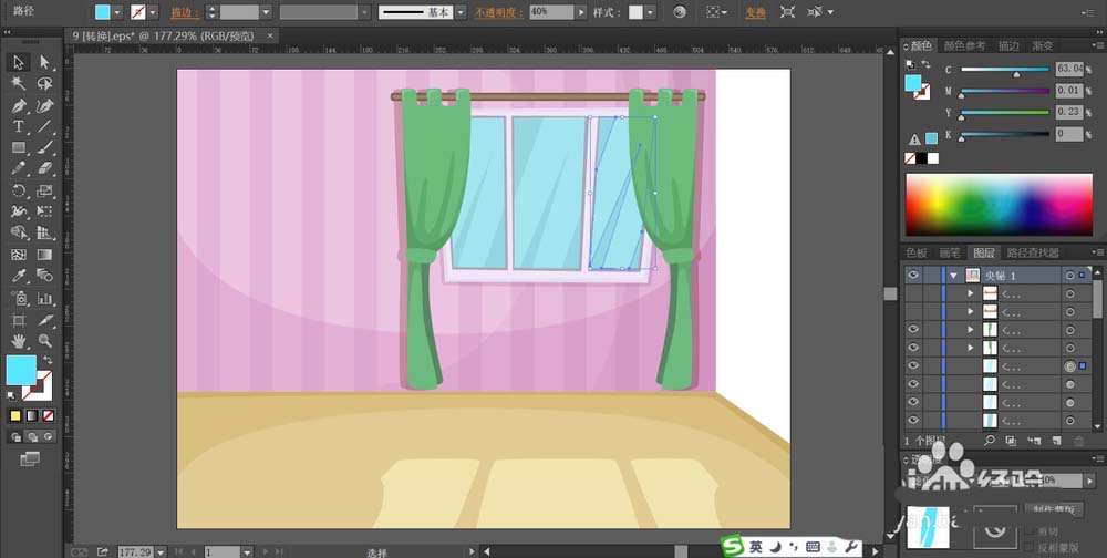 4、用绿色填充窗帘的路径,再用天蓝色填充窗户的玻璃的路径,分别给窗户做出高光效果,给窗帘做出暗光效果。