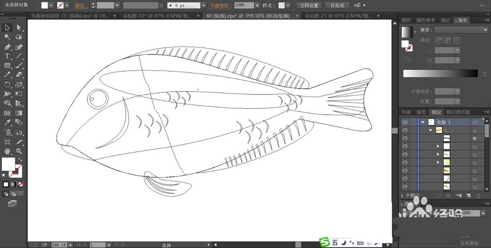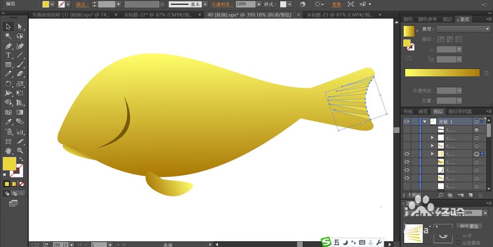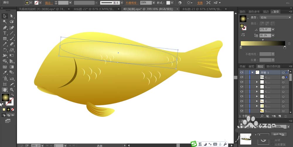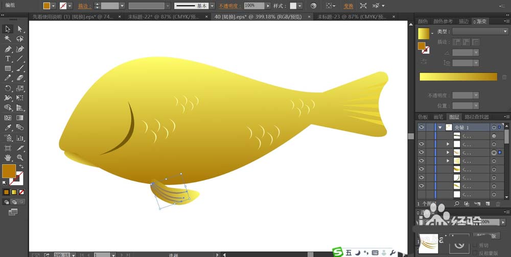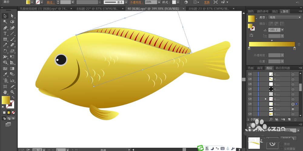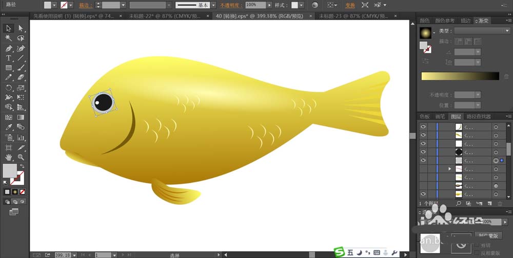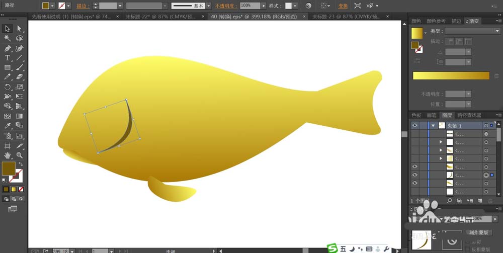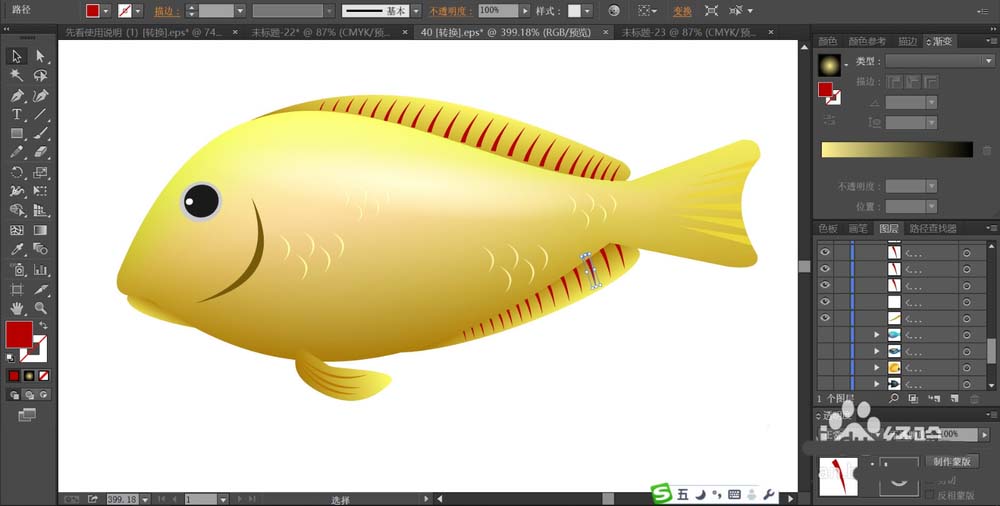 7、最后,我们再画出鱼的身体右侧下方的鱼鳃结构,并用黄色的渐变与红色搭配填充,完成黄色图片设计。