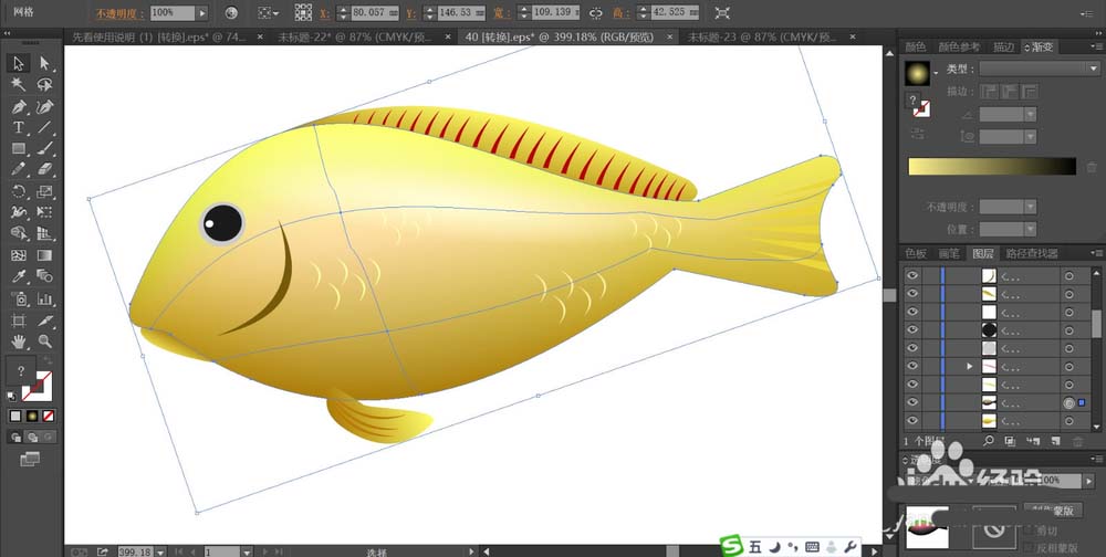 2、用黄色的渐变填充鱼儿的身体路径,再用同样的渐变色填充鱼的嘴巴的下方元素与鱼鳍的下方结构元素,在鱼鳃部位用暗黄色填充。