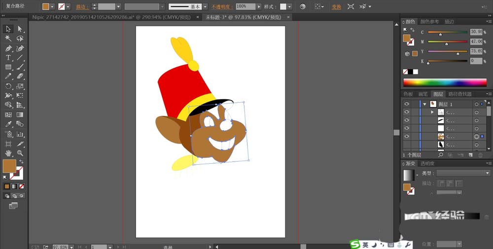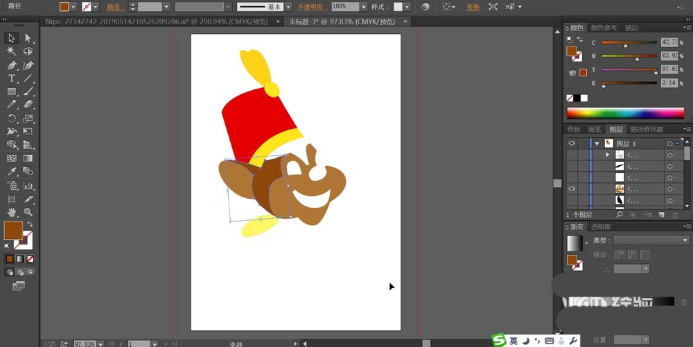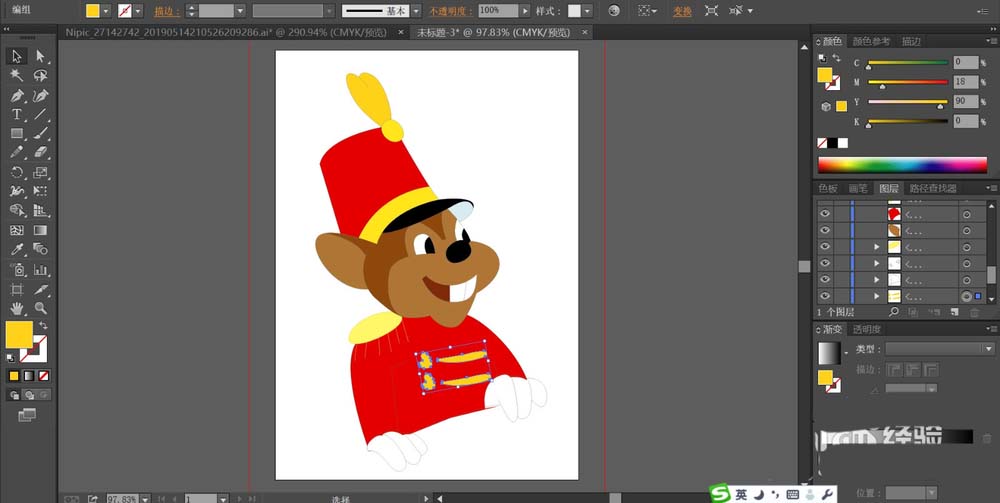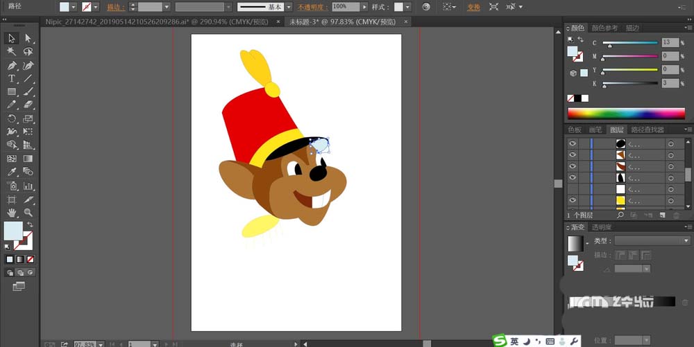 7、我们在这一步使用网格工具给老鼠的帽子、饰品、服饰分别做出相似色的渐变效果,从而让整个老鼠的形象更加的生动。