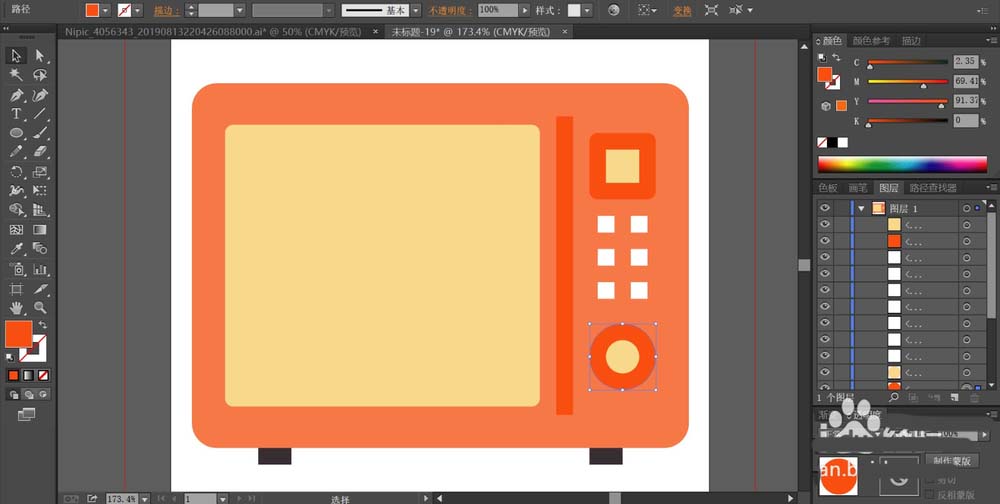 4、接着,我们来设计一款更有现代感的微波炉,先用橙红色填充微波炉的机柜,再用橙黄色填充小门。
