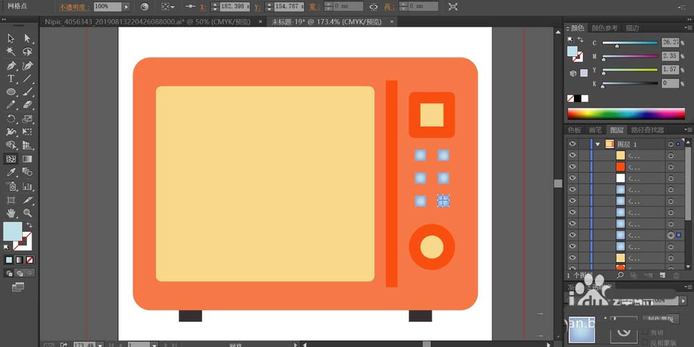 7、最后,我们用网格工具给微波炉的小门做出橙色到白色的渐变效果,再给上下大的按钮与微波炉的主体分别做出相似色的渐变效果,完成微波炉产品设计。