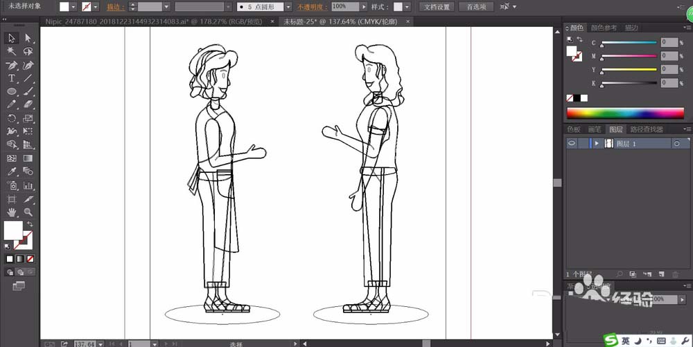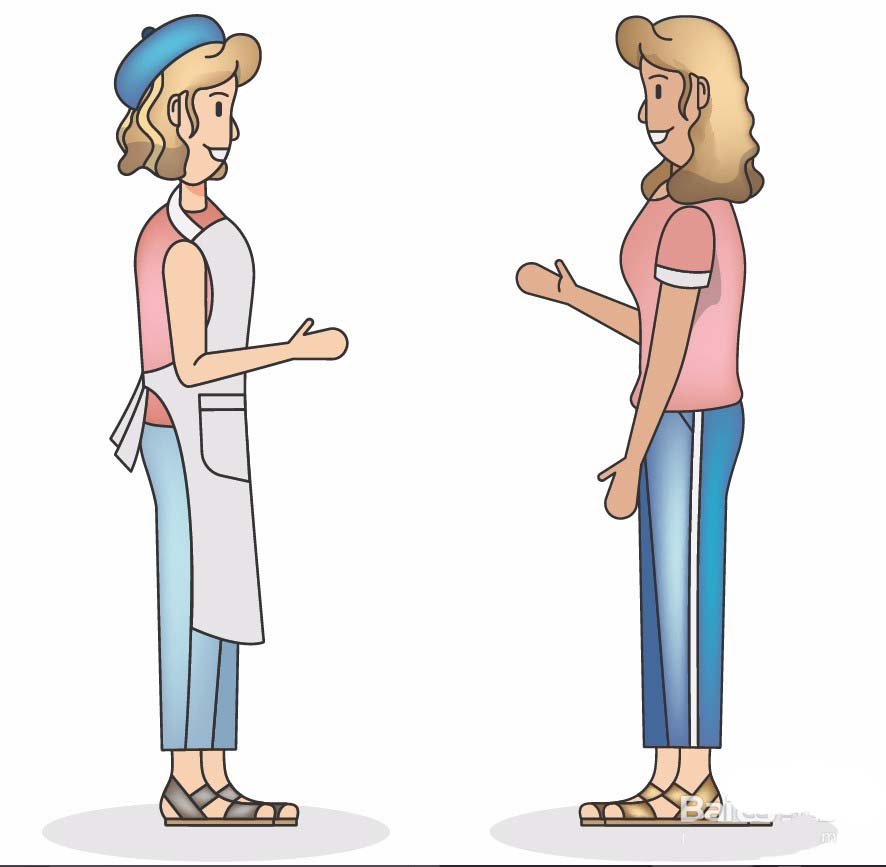 1、先用钢笔画出左右两位女子的基本身体轮廓,包括:头发、侧面眼晴与嘴巴线条路径,双手动作,双方的服饰与鞋子等元素。
