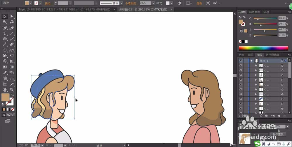 2、用灰咖啡色填充女子的头发,用海蓝色填充左侧女子的帽子,用粉色与灰黑色填充女子的脸蛋、眼晴与嘴巴,牙齿用白色填充。