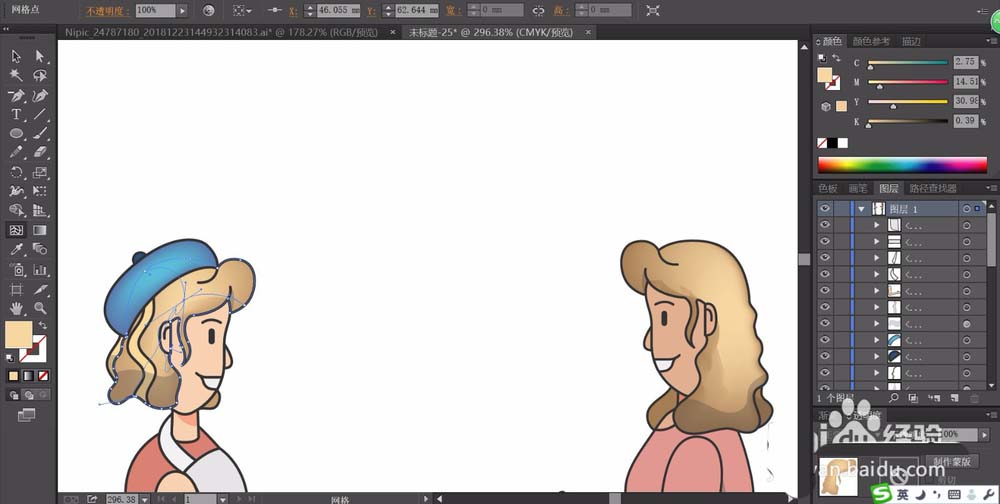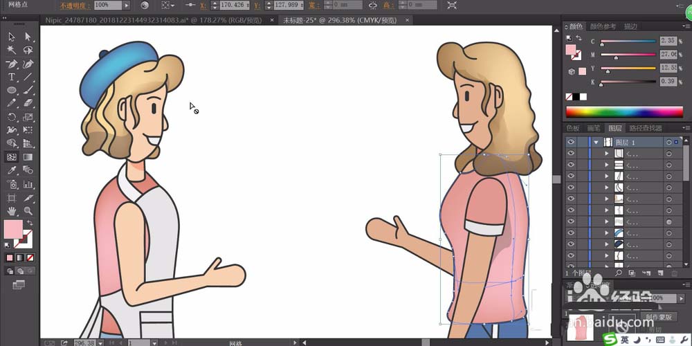 5、我们使用网格工具点击不同的元素,给左侧女子的服饰的粉红色块与右侧女子的服饰做出粉红色到淡粉色的渐变效果。