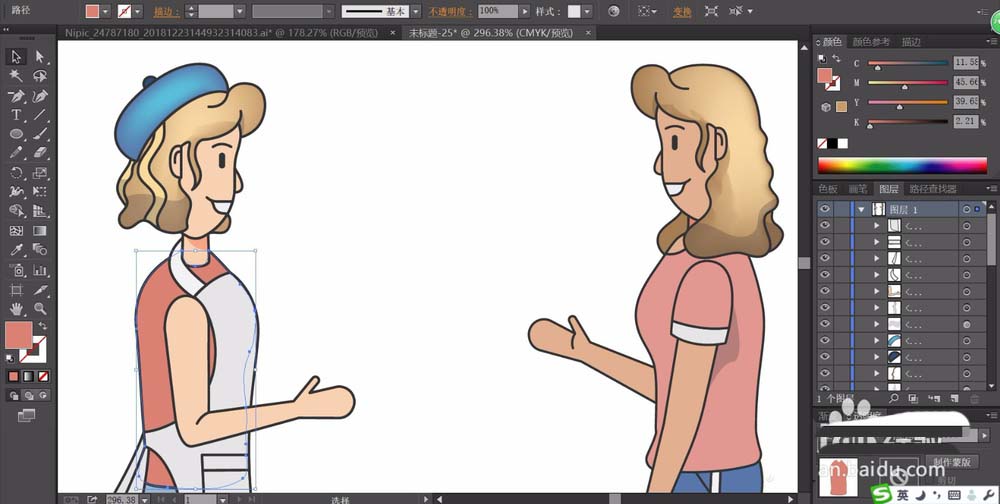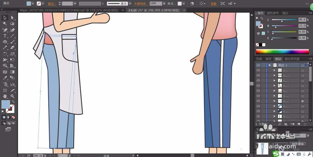 6、这一步,我们用天蓝色与灰白色搭配填充左侧女子的长裤与围裙的路径,用海蓝色填充右侧女子的长裤,再用网格工具做出长裤的渐变效果。