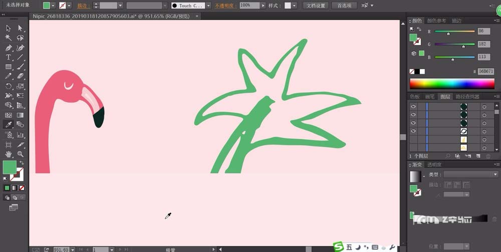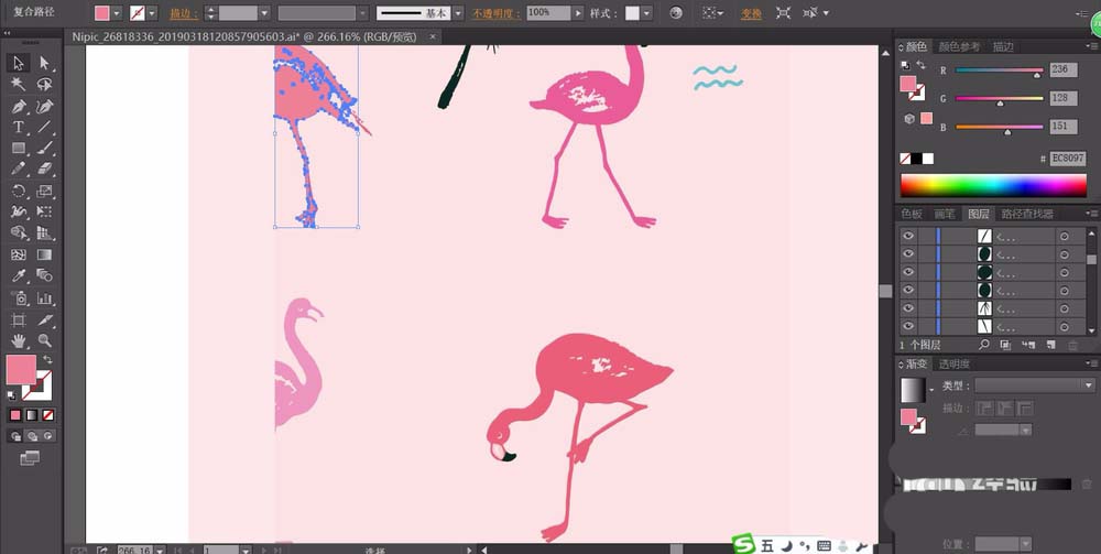 2、大的背景用桃红红色填充,我们用粉红色与黑色搭配填充火烈鸟的路径,我们用绿色填充树叶的轮廓。