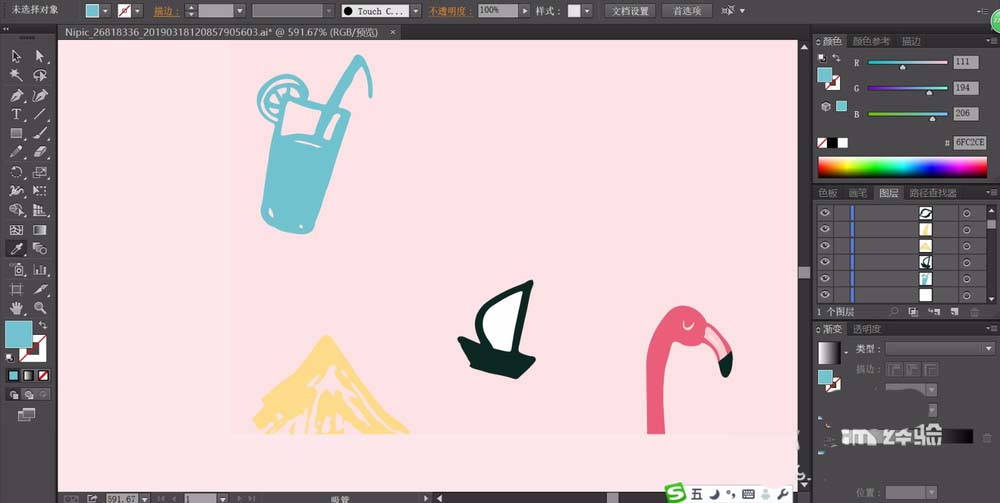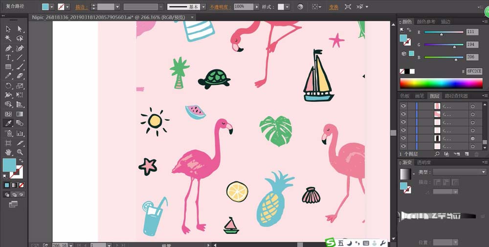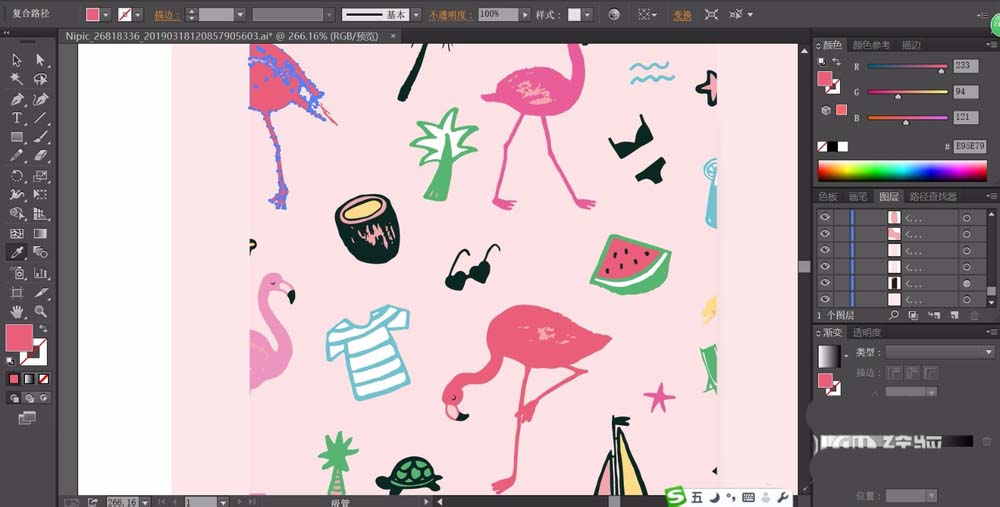 4、用不同明度的粉红色填充火烈鸟的路径,用绿色与粉红色搭配填充小西瓜的路径,用蓝色与白色填充衬衫的路径,用绿色与黑色填充小乌龟的路径。