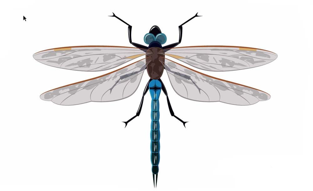3、继续用蓝色与黑色搭配填充蜻蜓的头部与身体尾巴的路径,用棕灰色色填充蜻蜓头部下方的中间身体路径。