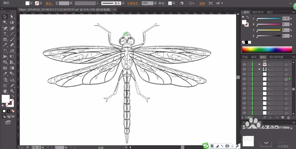 1、先用钢笔画出蜻蜓的头部、翅膀、身体与图案,还有腿等基本元素的路径。