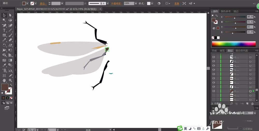 6、最后,我们给翅膀的上边缘用土黄色进行描边,对于翅膀的下方边缘用灰黑色进行描边,对于蜻蜓身体上面的高光区域用白色进行填充,完成蜻蜓图片设计。