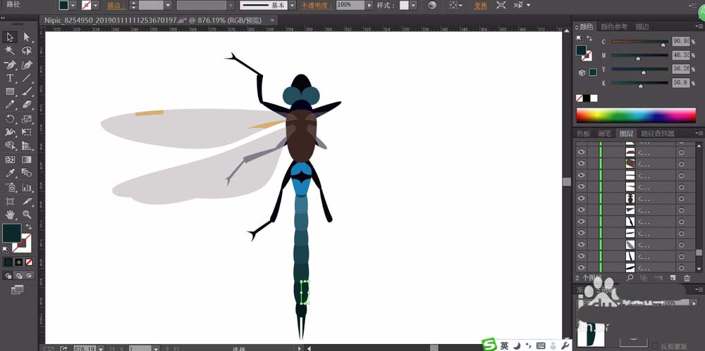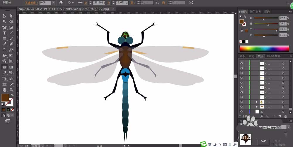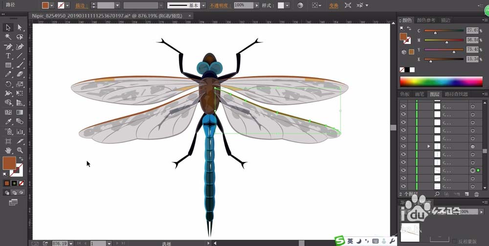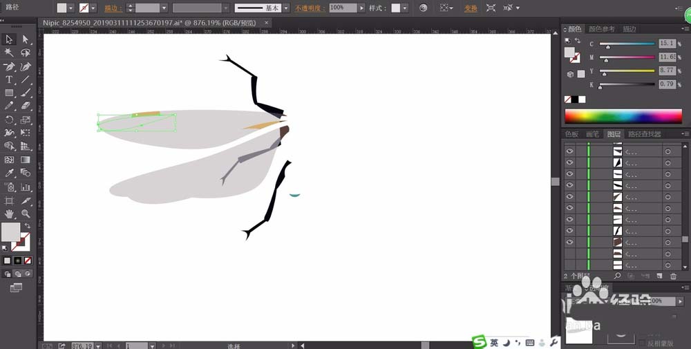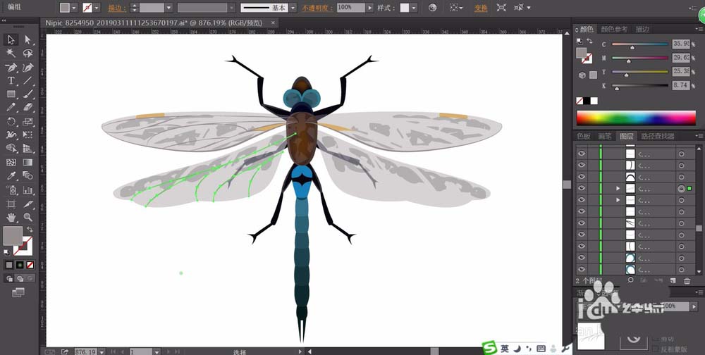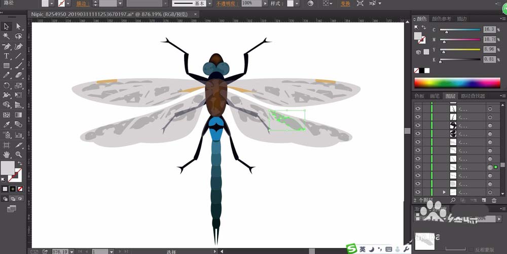 4、使用同样的方法完成蜻蜓的右侧翅膀的填色,翅膀上面的图案用灰色填充,我们设置成正片叠底的模式,让图案的区域变得暗一些。