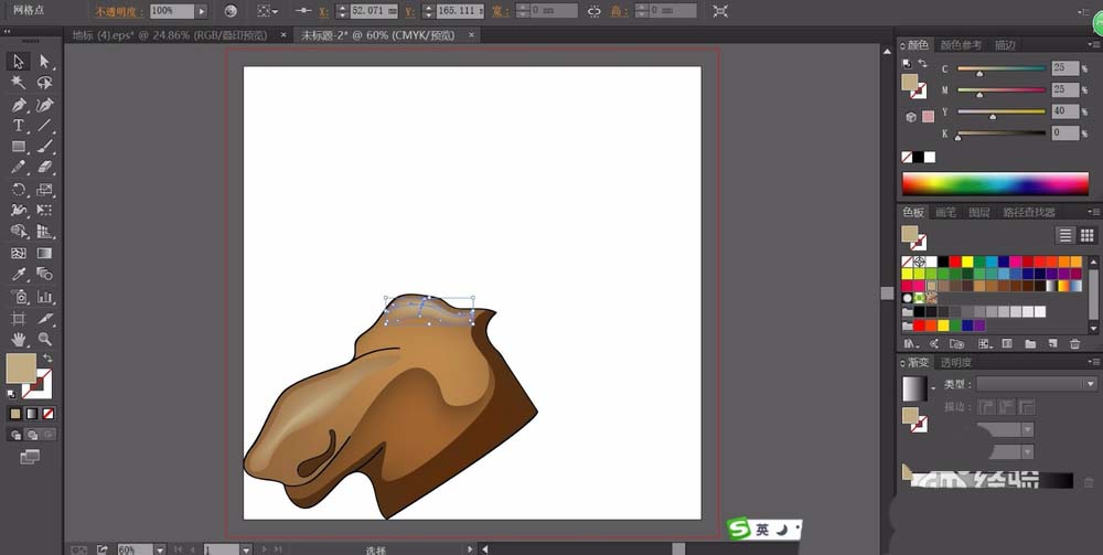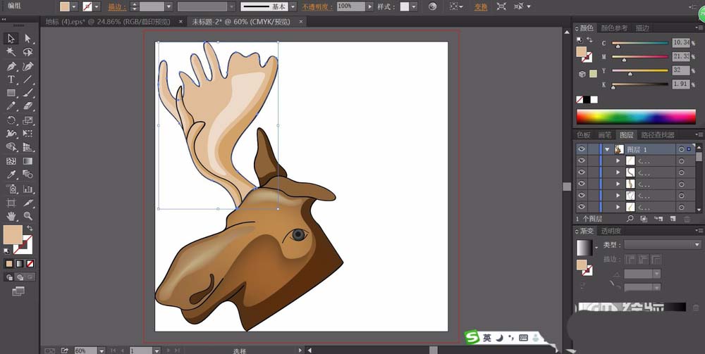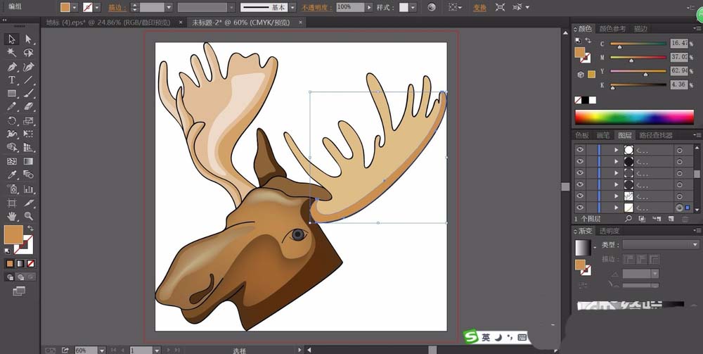 3、使用网格工具,给不同色彩的路径做出渐变的效果,让整个鹿头的立体材质呈现出来。