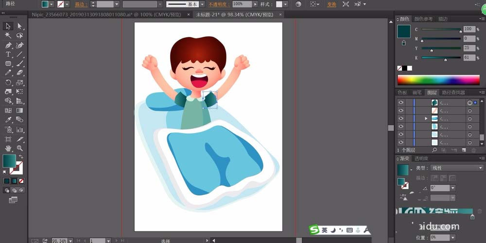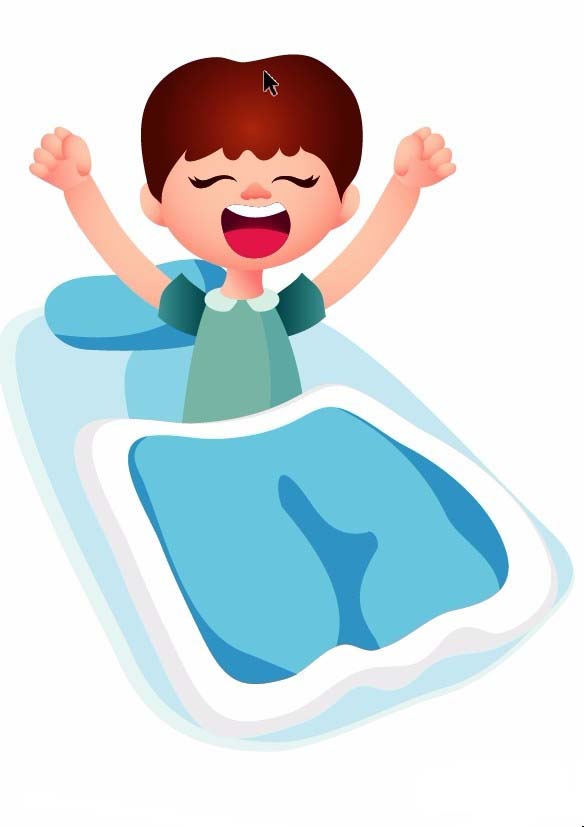 6、用不同明度的青色填充小孩的上衣路径,再用青色的渐变填充小孩衣服的袖口路径,完成起床素材设计。