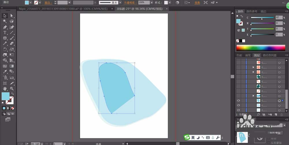 2、用海蓝色与天蓝色搭配填充大床的不同层次的路径。